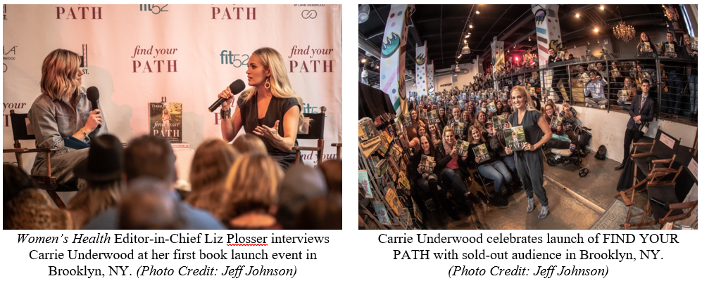 Carrie Underwood’s first book, FIND YOUR PATH: Honor Your Body, Fuel Your Soul, and Get Strong with the Fit52 Life, is on sale today (Dey Street Books). Underwood kicked of a multi-city promo tour on Monday in Brooklyn, NY, with upcoming events in Stamford, CT; Nashville, TN and Los Angeles, CA, all of which sold out in under a minute. She will take over the NBC airwaves on March 3 with appearances on the 8:00, 9:00 and 10:00 AM hours of “The Today Show” and will appear on “The Tonight Show with Jimmy Fallon” on March 6, followed by “Rachael Ray” on March 9, among other national broadcasts. Underwood also graces the covers ofWomen’s Health and Parade Magazine, with additional print and online coverage in InStyle, People, USA Today, Entertainment Weekly, and more.