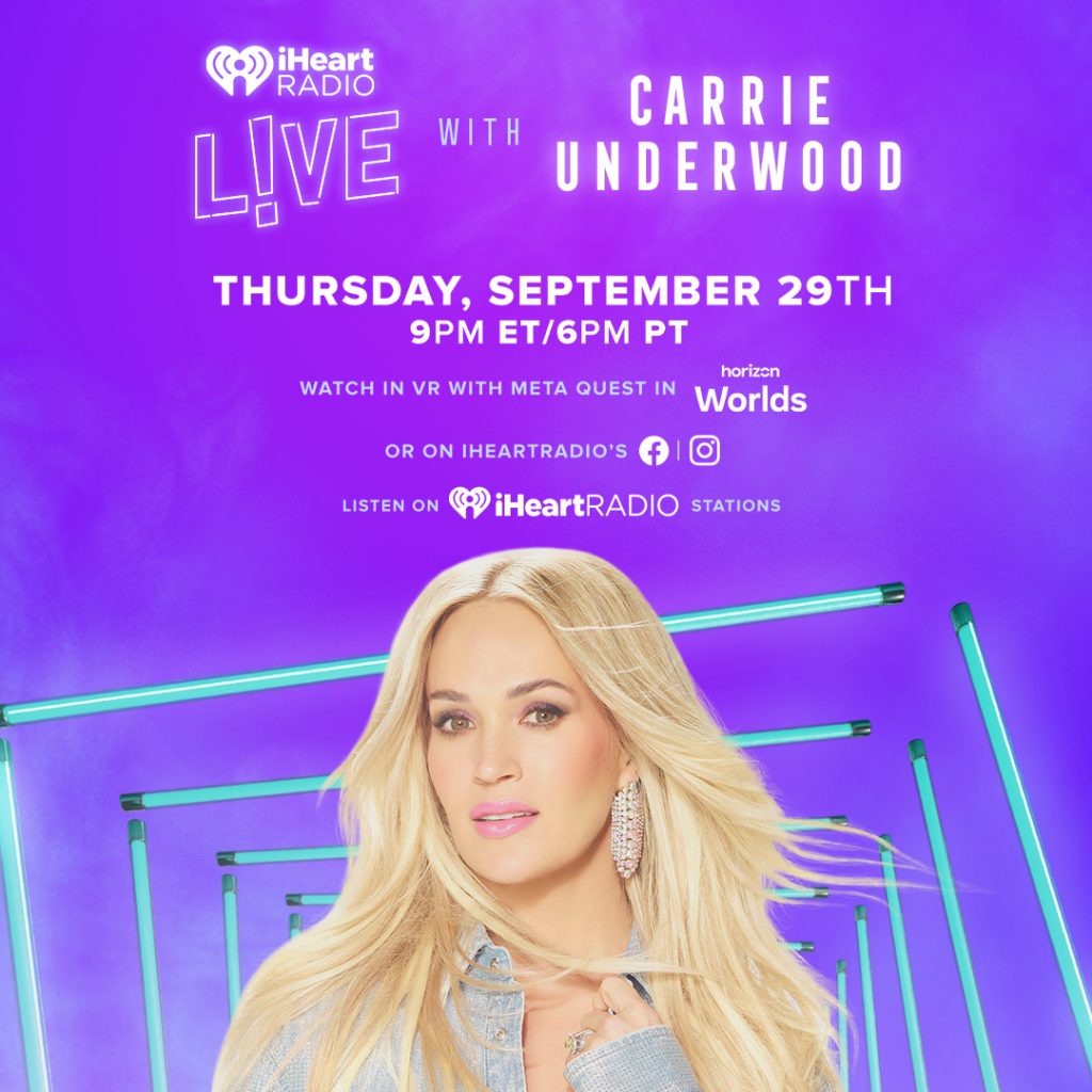 Carrie has teamed up with iHeartRadio for a special performance, iHeartMedia presents “iHeartRadio LIVE with Carrie Underwood,” in celebration of her new album Denim & Rhinestones. Fans with a Meta Quest 2 headset can view the performance in Meta Horizon Worlds and on iHeartRadio Facebook and Instagram on Thursday, September 29, 2022, at 9 p.m. ET.The lead single from Denim & Rhinestones, “Ghost Story,” is currently in the Top 10 at country radio and has garnered over 133 million global streams.