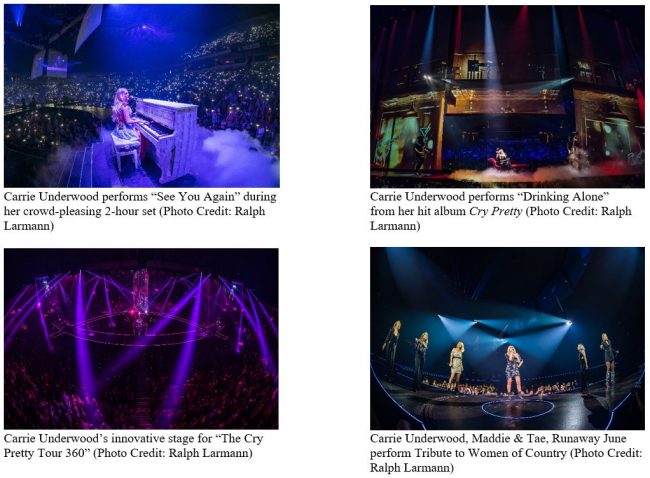 Underwood’s dynamic two-hour set kept fans on their feet, featuring songs from her critically-acclaimed album, Cry Pretty, including the title track, her recent hit single, Love Wins, and the just-released Southbound, which had its broadcast debut on the recent ACM Awards and was the most-added single at country radio last week. Another highlight of the show featured the winner of an ongoing contest wherein fans submit stories about what Underwood’s hit anthem, The Champion, means to them for the chance to join her on stage and perform the rap originated by Ludacris on the platinum track.