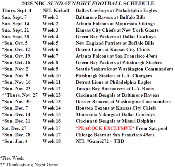 The show open for Sunday Night Football, primetime television’s No. 1 program for an unprecedented 14 consecutive years, will debut on Sunday, Sept. 7 leading into the season debut of SNF featuring the past two NFL MVPs as Lamar Jackson (’23 MVP) and the AFC North champion Baltimore Ravens visit Josh Allen (’24 MVP) and the AFC East champion Buffalo Bills in a rematch of last season’s AFC Divisional Playoff.